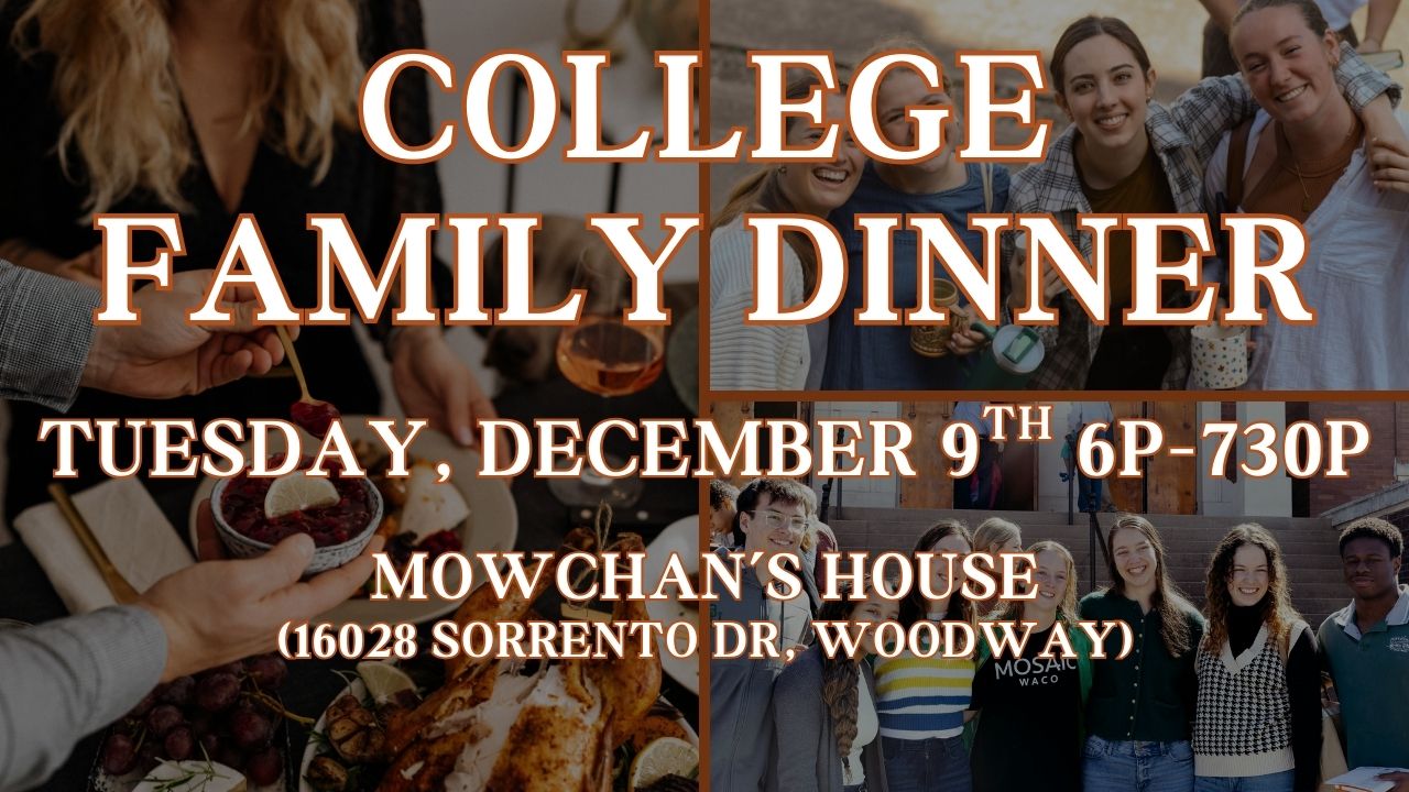 You are warmly invited to a College Family Dinner on Tuesday, December 9th 6p-730p at the Mowchan’s House. As the semester winds down, we want to offer a place to pause, enjoy a comforting meal, and connect with our Mosaic family.