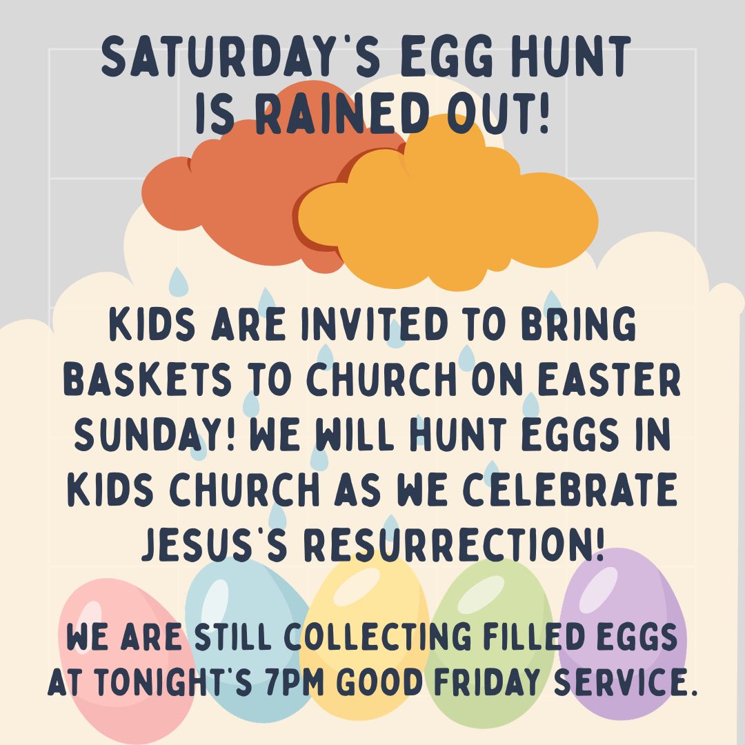 Saturday’s Egg Hunt is cancelled due to weather. Kids will hunt eggs in Kids Church on Sunday.